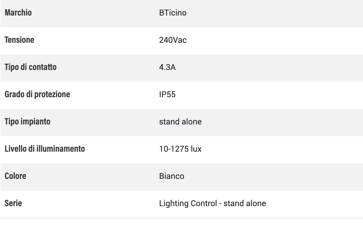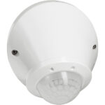 Switch Sensor ad infrarosso passivo, per il rilevamento del movimento e del livello di illuminamento, tecnologia “Zero Crossing”, gestione ON/OFF del carico, installazione a parete o a soffitto, grado di protezione IP55, connessione a morsetti a vite, area di copertura di larghezza 8 m per 360° e profondità di campo di 8 m per un’altezza di installazione di 2.5 m, altezza massima di installazione di 6 m, alimentazione 240 V a.c., 50/60 Hz, carico massimo di 4.3 A a 230 V a.c., regolazione tramite trimmer del livello di illuminamento da 10 lux a 1275 lux e del tempo di ritardo da 10 s a 10 min.